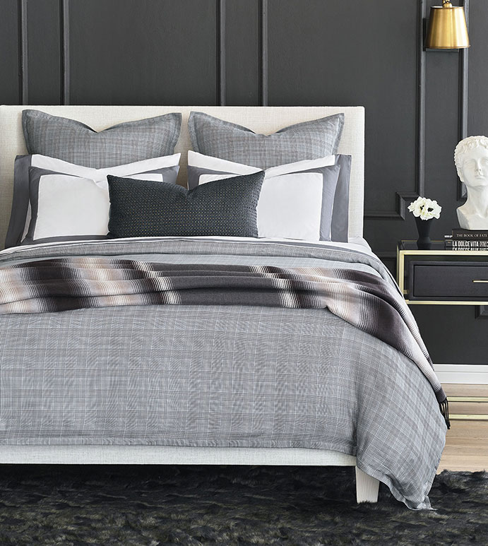 用引人注目的大維系列打造英俊的主臥室美學(xué)。這個(gè)溫文爾雅的系列受到傳統(tǒng)男士西裝的啟發(fā),采用 100% 天絲和平紋面料制成的千鳥格格子被套,邊緣對比鮮明。羊毛混紡的裝飾枕采用燒花方形圖案,讓這款定制造型更加完美。