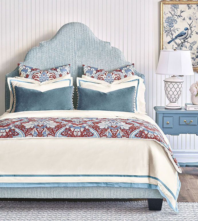 新英格蘭的夏日激發(fā)了迷人的親膚系列。來自意大利頂級時裝工廠的錦緞圖案,印在100%有機埃及棉的緞紋面料上,呈現(xiàn)出清爽的藍色和濃艷的深紅色。藍色緞帶裝飾邊的被套,營造出簡約經(jīng)典的美感。